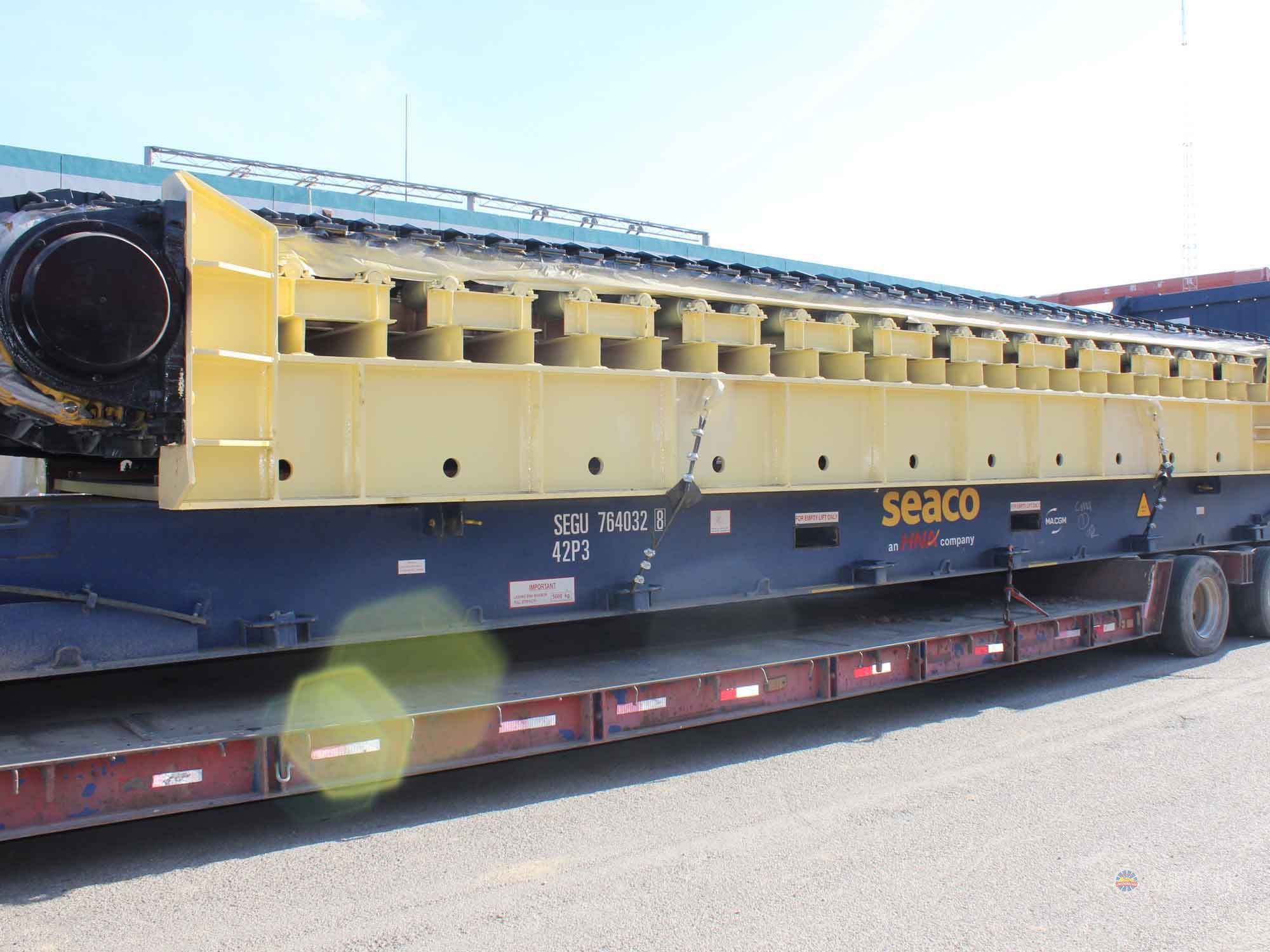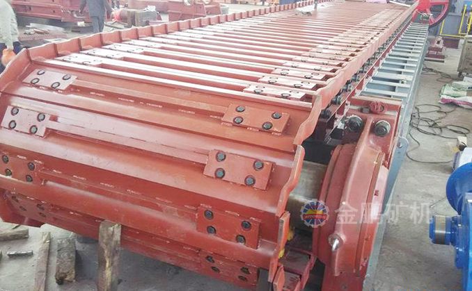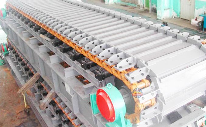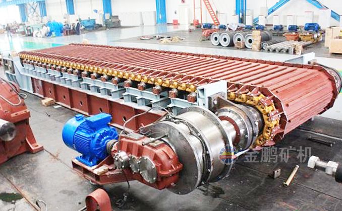 采用節距為200mm的高強度模鍛鏈條為牽引件,兩根鏈條繞過安裝在機體頭部的一對驅動鏈輪和機體尾部的一對張緊輪聯成封閉形回路,在兩排鏈條的每個鏈節上裝配了相互交迭的、重型結構的輸送槽而成為一個連續的能夠運載物料的輸送線路。其自重和物料的重量由安裝在機體上的多排支重輪、鏈托輪和滑道梁支承。傳動系統經交流變頻調速電動機聯接減速機,再由漲套與驅動裝置直聯驅動運載機構低速運行。將尾部料倉卸入的物料沿輸送線路運至機體的前方排出,實現向下方的工作機械連續均勻喂料的目的。
