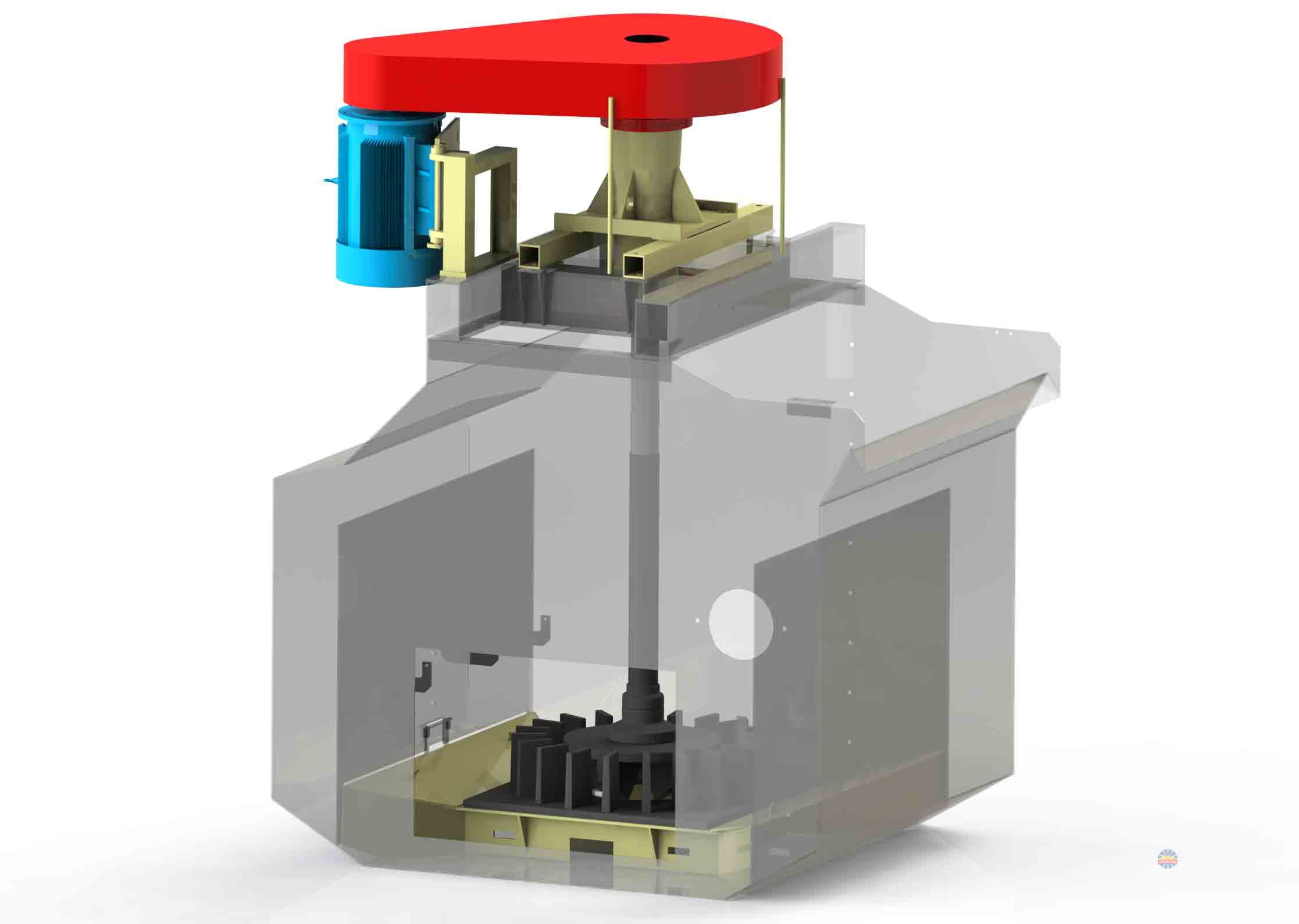 當浮選機葉輪旋轉時,來自鼓風機的低壓空氣通過分配器周邊的孔進入葉輪葉片間,與此同時假底下面礦漿由葉輪下部被吸入到葉輪葉片間,礦漿和空氣在葉輪葉片間充分混合后,從葉輪上半部周邊排出,排出的礦漿空氣混合物由定子穩流后,穿過格子板,進入槽內上部區。此時浮選機內部區礦漿中含有大量氣泡,而外側循環通道內礦漿中不含氣泡(或古有極少量氣泡),于是內外礦漿就形成壓差,在此壓差及葉輪抽吸力作用下,內部區礦漿和氣泡在設定的流速下起上升通過格子板,將粗顆粒礦物帶到格子板上方,形成粗顆粒礦物懸浮層,而礦化氣泡和含有較細礦粒的礦漿則繼 續上升,礦化氣泡升到液面形成泡沫層,含有較細礦粒的礦漿則越過隔板經循環通道,進入葉輪區加入再循環。