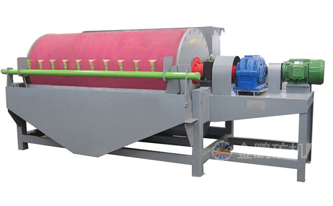 礦漿經給礦箱流入槽體后,在給礦噴水管的水流作用下,礦粒呈松散狀態(tài)進入槽體的給礦區(qū)。在磁場的作用,磁性礦粒發(fā)生磁聚而形成“磁團”或“磁鏈”,“磁團”或“磁鏈”在礦漿中受磁力作用,向磁極運動,而被吸附在圓筒上。由于磁極的極性沿圓筒旋轉方向是交替排列的,并且在工作時固定不動,“磁團”或“磁鏈”在隨圓筒旋轉時,由于磁極交替而產生磁攪拌現(xiàn)象,被夾雜在“磁團”或“磁鏈”中的脈石等非磁性礦物在翻動中脫落下來,最終被吸在圓筒表面的“磁團”或“磁蓮”即是精礦。精礦隨圓筒轉到磁系邊緣磁力最弱處,在卸礦水管噴出的沖洗水流作用下被卸到精礦槽中。非磁性或弱磁性礦物被留在礦漿中隨礦漿排出槽外,即是尾礦。